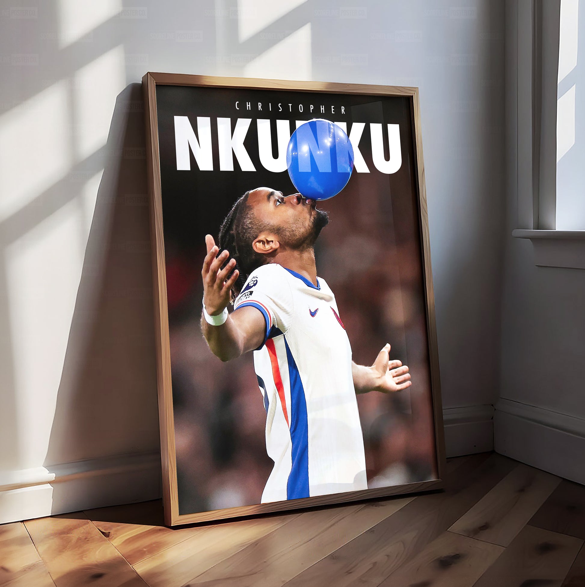 This dynamic football poster captures Chelsea's Christopher Nkunku in one of his most iconic moments: his famous balloon celebration. After scoring yet another stunning goal, Nkunku’s jubilant and unique gesture became a symbol of his infectious personality and flair on the pitch.