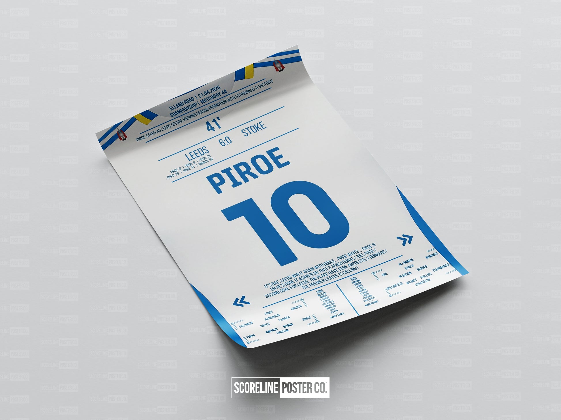 This is our iconic Leeds United shirt poster celebrating Joel Piroe’s 41' strike in the 6-0 rout of Stoke at Elland Road (21.04.2025). Features Championship Matchday 44, scorers, lineups, and commentary: It’s Bae... Piroe waits... PIROE!! Oh he’s done it again!! That’s sensational, Joel Piroe!