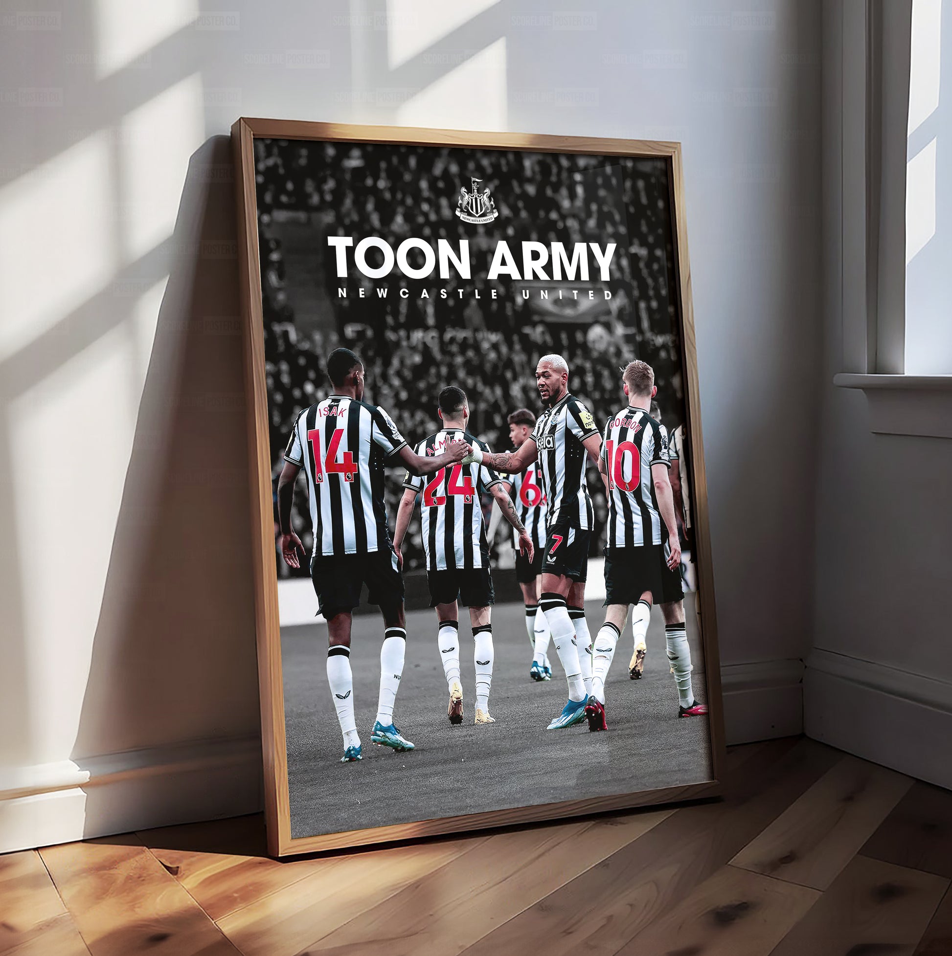 This vibrant football poster captures the pure joy and unity of Newcastle United’s players as they celebrate together after scoring a brilliant goal. With arms around each other, smiles all around, and the unmistakable black-and-white stripes of their iconic kit.
