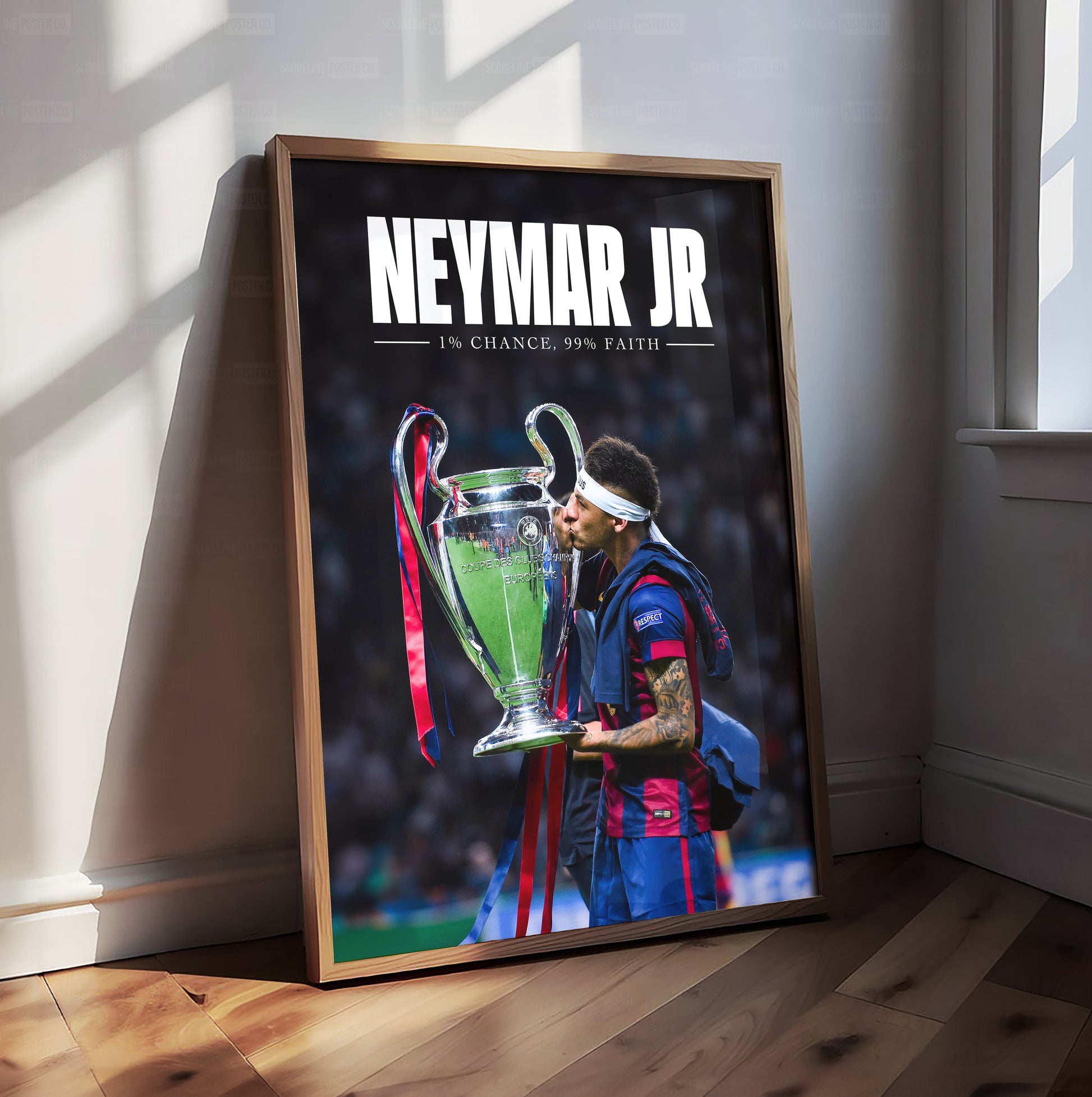 This electrifying football poster captures the magic of Neymar Jr. in his prime, celebrating one of the most iconic moments of his career - lifting the UEFA Champions League trophy with FC Barcelona.