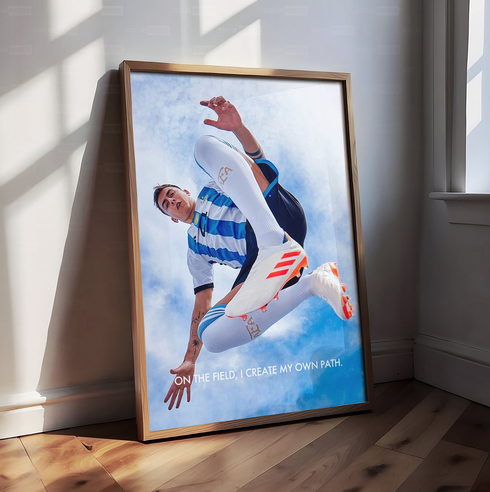 This electrifying poster captures Paulo Dybala in full flight - leaping high above the lens, as if soaring through the air while the world watches from below. His eyes locked downward, the camera catches him mid-jump in a perspective that turns the football pitch into a stage and Dybala into the star.