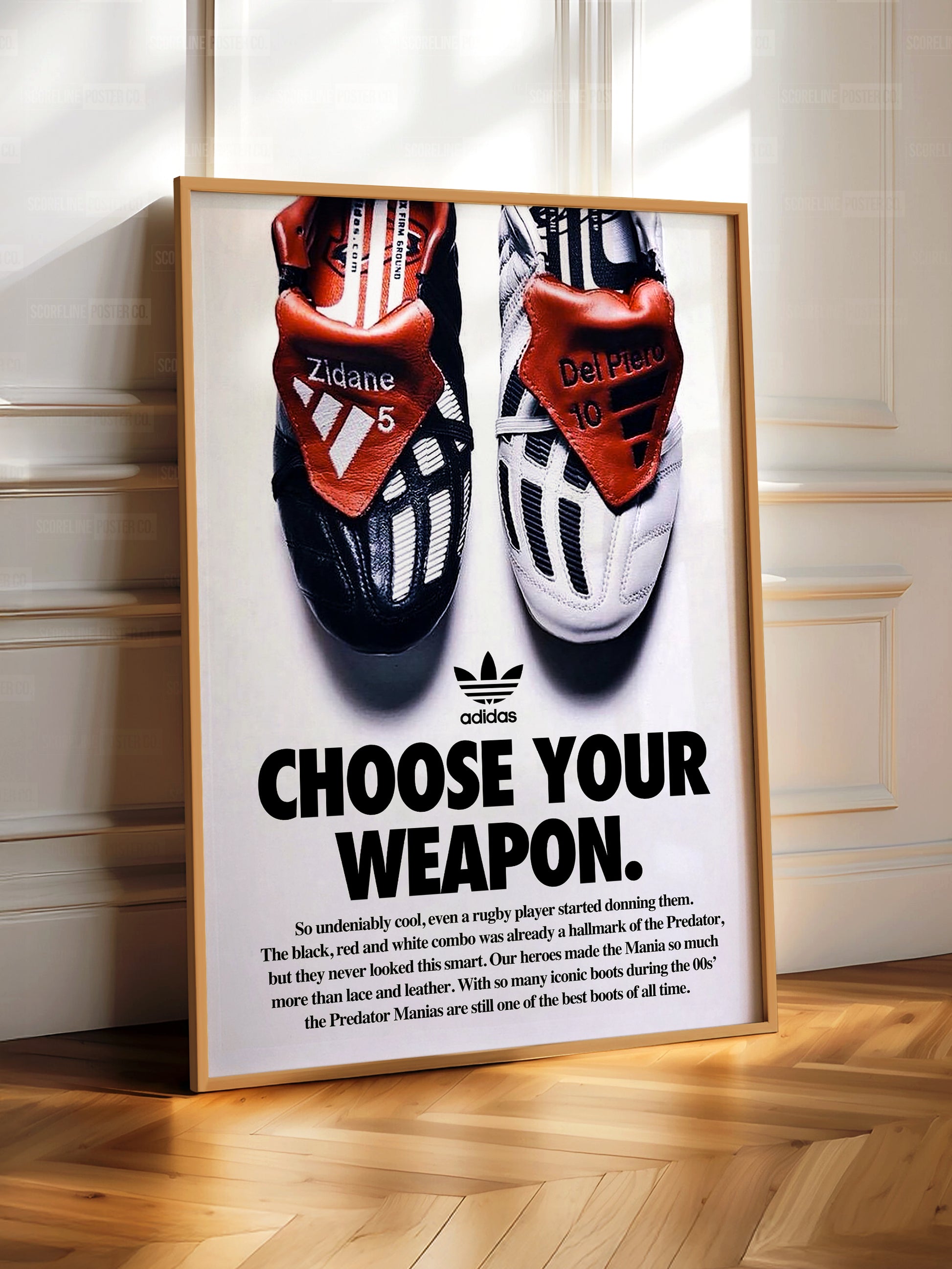 This striking football poster showcases the legendary Predator Mania boots, one of the most iconic football boots in history, paired with the bold caption "Choose Your Weapon".