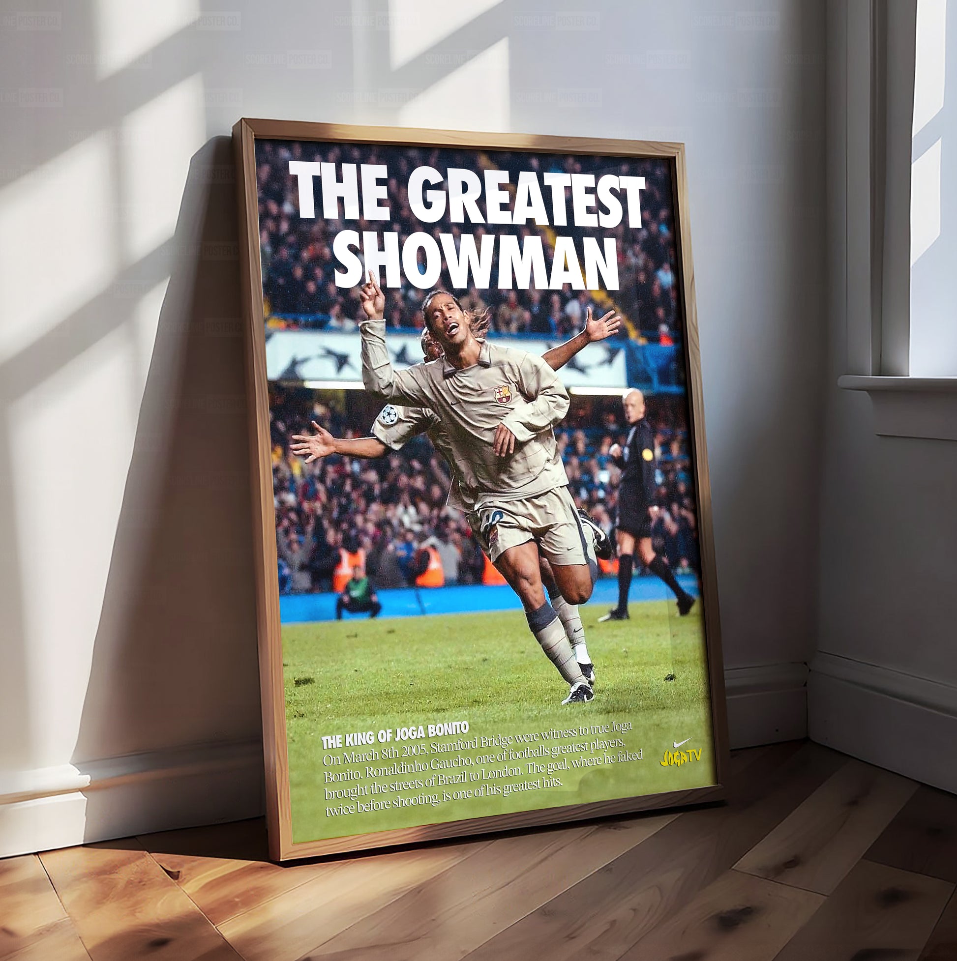Celebrate a moment of pure football magic with this stunning poster featuring Ronaldinho, the Brazilian maestro, in one of the most iconic moments of his career. Captured mid-celebration after his audacious toe-poked goal against Chelsea in the UEFA Champions League at Stamford Bridge.