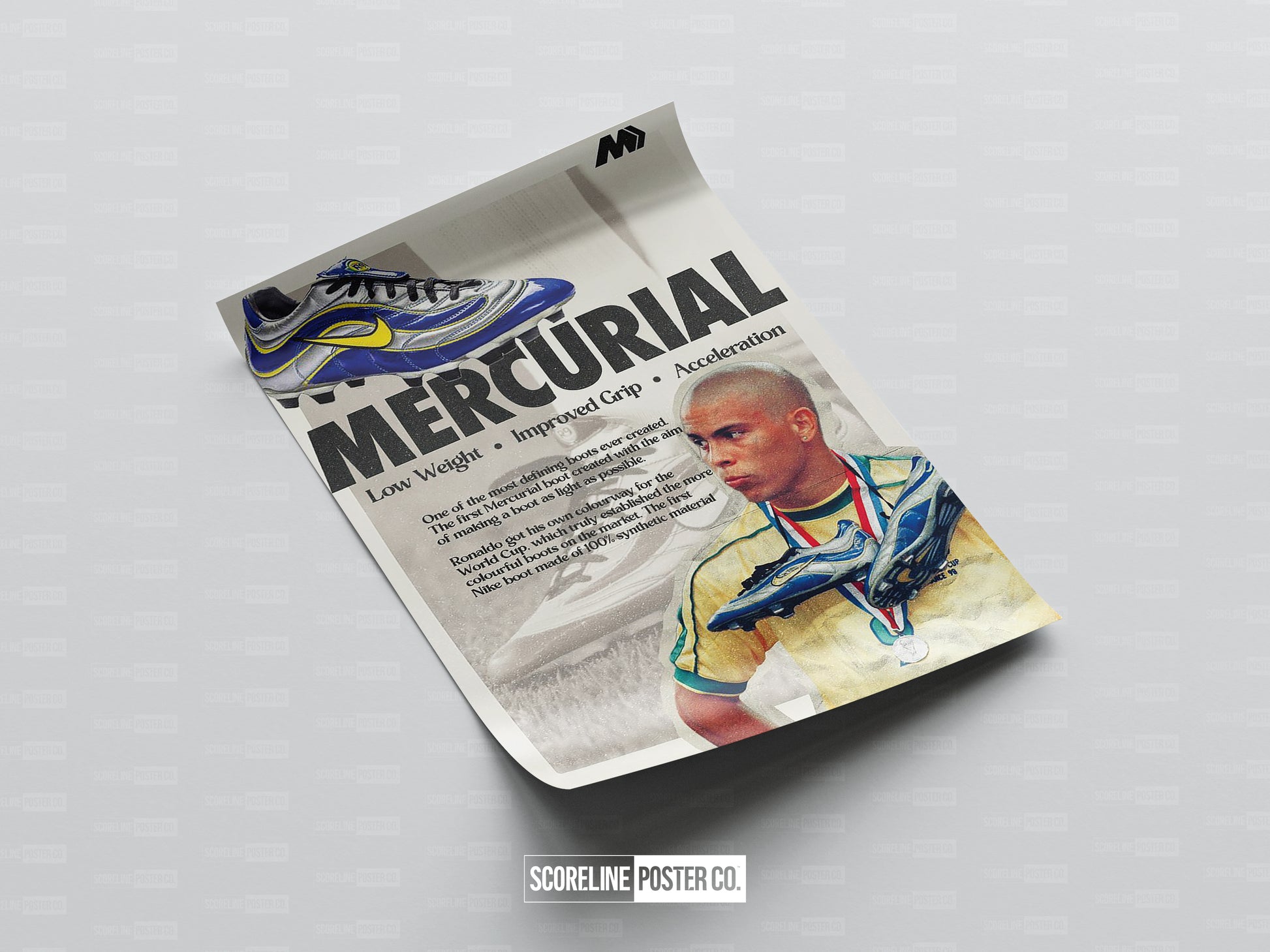 Our iconic Nike poster celebrating the revolutionary 1998 Mercurial boots worn by Ronaldo at the World Cup. Features the silver/blue/yellow R9 colourway, low weight design, and the Brazilian phenom holding his silver ball award.